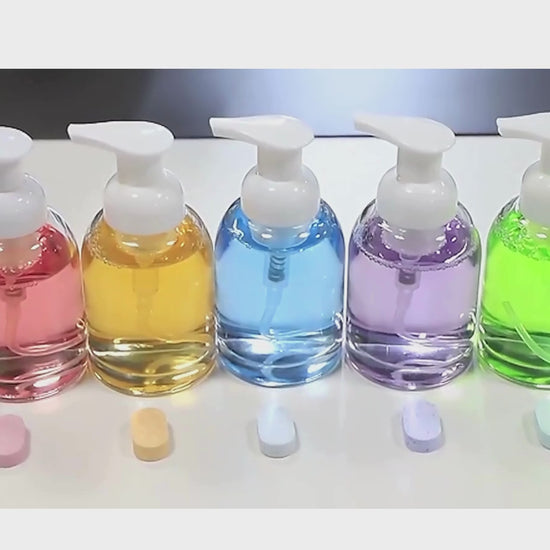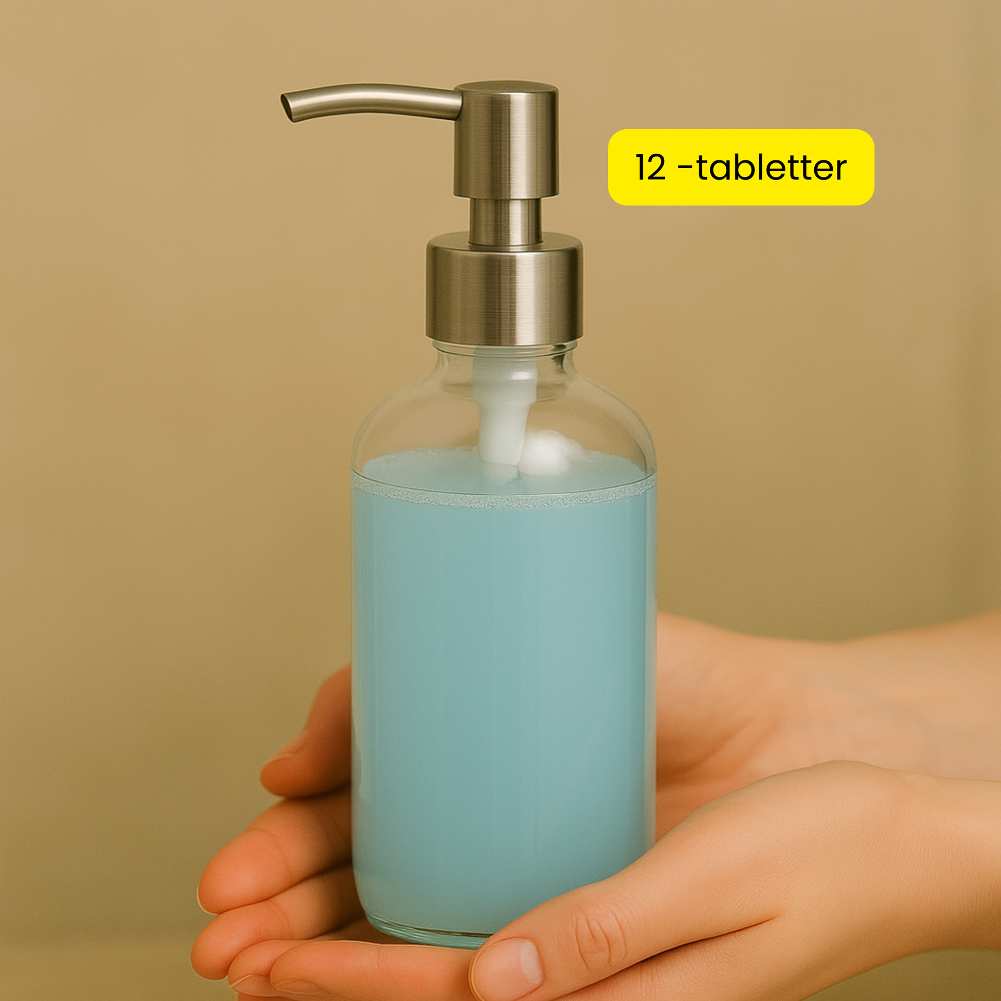 Lägg tabletten i en tvålpump, fyll på med varmt vatten – klart. På några minuter har du en skummande, miljövänlig tvål utan mikroplaster, parabener eller onödiga kemikalier. Skonsam mot miljön & silkeslen hud.